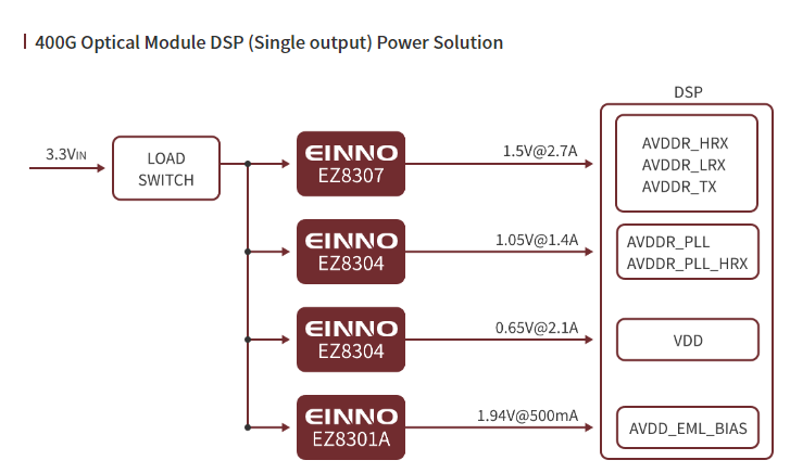 데이터 센터와 클라우드 컴퓨팅이 지속적으로 발전함에 따라 고속, 대용량 데이터 전송이 필요해지고 있습니다. 이러한 추세는 점차 고속, 소형화, 저전력 소비의 광학 모듈 개발로 옮겨가고 있습니다. Einno Semi는 지속적으로 기술을 업데이트하고 반복하기 위해 연구 개발에 대한 투자를 늘리고 있습니다. 초고효율, 초저소음, 초고동적 응답을 보장하기 위해 ezSiP Micro Power Module, 초 고집적, 독립 칩 설계를 개발하고 소형 / 얇음 / 경량, 다중 모듈 핀 PCB 레이아웃 호환성, 다중 출력, 병렬 전류 공유, 유연한 구성, 음의 전압 출력을 통해 당사 제품을 네트워크에서 널리 사용하여 장거리 고속 광섬유 통신을 달성 할 수 있도록합니다.